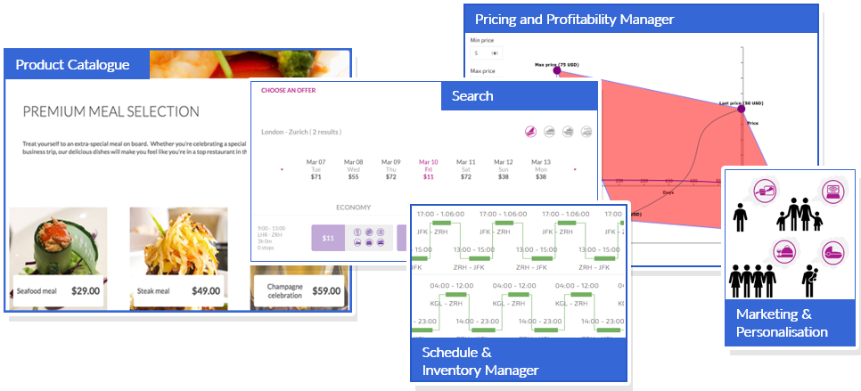 - Simply set up destinations, classes, seat types, equipment versions, ancillaries, amenities and bundles with powerful rich content and generate via the t-commerce product catalogue